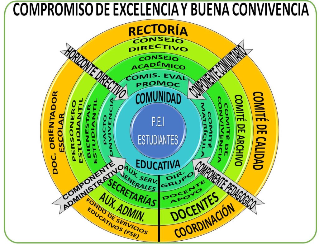 Allí se presentan cuatro componentes: directivo, pedagógico, comunitario y administrativo, cada uno con los estamentos que lo conforman, los cuales están enfocados a mejorar la calidad de la educación que se brinda en la institución.